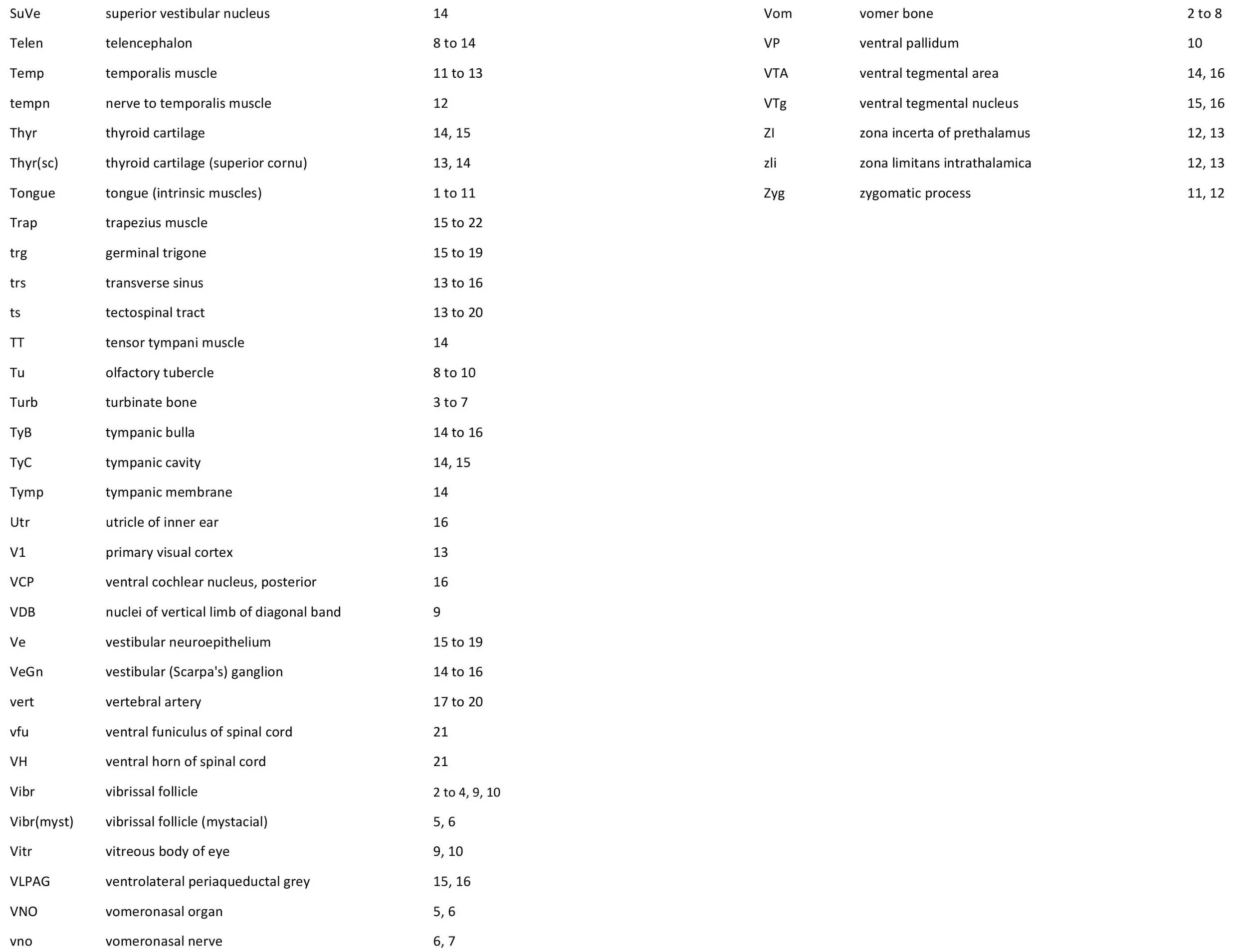 Most cranial nerves are visible (CN1 – olfactory in plates 5 to 8, CN3 – oculomotor in plates 9 to 15, CN4 – trochlear in plates 10 to 18, CN5 – trigeminal in plates 9 to 13, CN7 – facial in plates 14 to 16, CN8 – vestibulocochlear in plate 15, CN10 – vagal in plates 13 to 19, CN11 – spinal accessory in plates 15 to 19, CN12 – hypoglossal in plates 9 to 19). As with all marsupials, the most differentiated cranial nerve is the trigeminal, with all three divisions visible (ophthalmic, maxillary and mandibular) including some of the major branches of the maxillary and mandibular division (e.g. 5max/inf in plates 2 to 8; ialvn in plates 3 to 10).