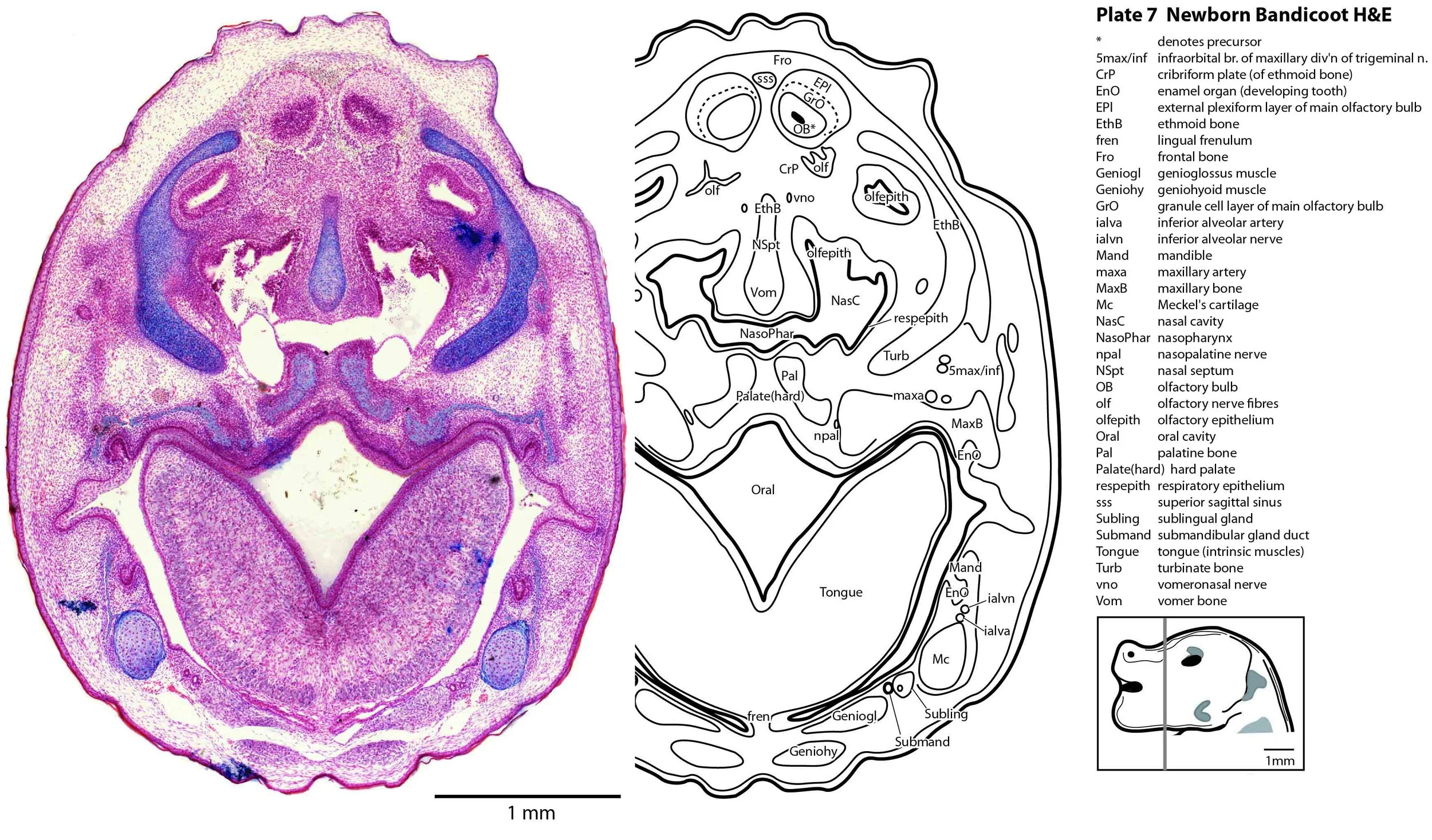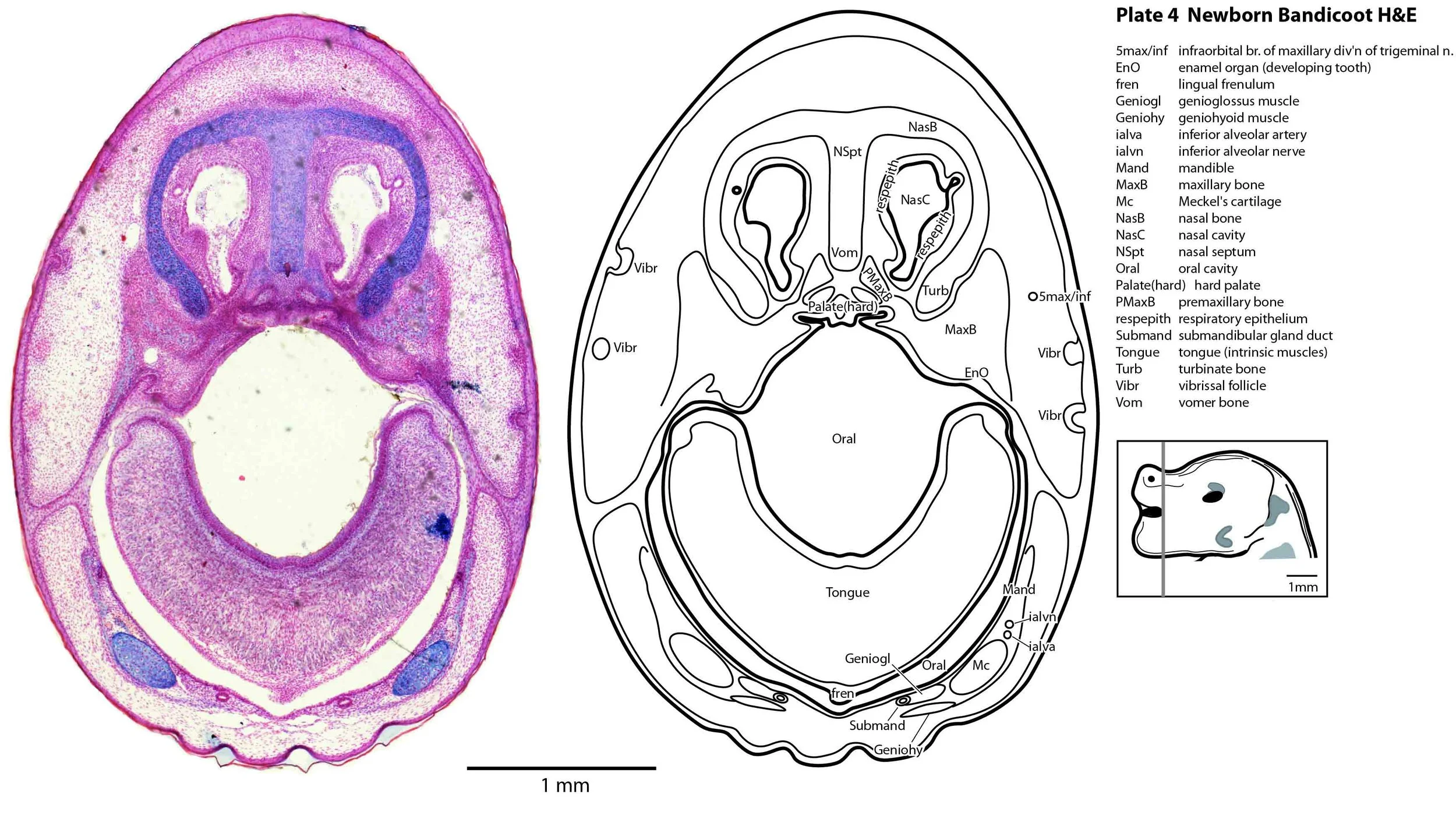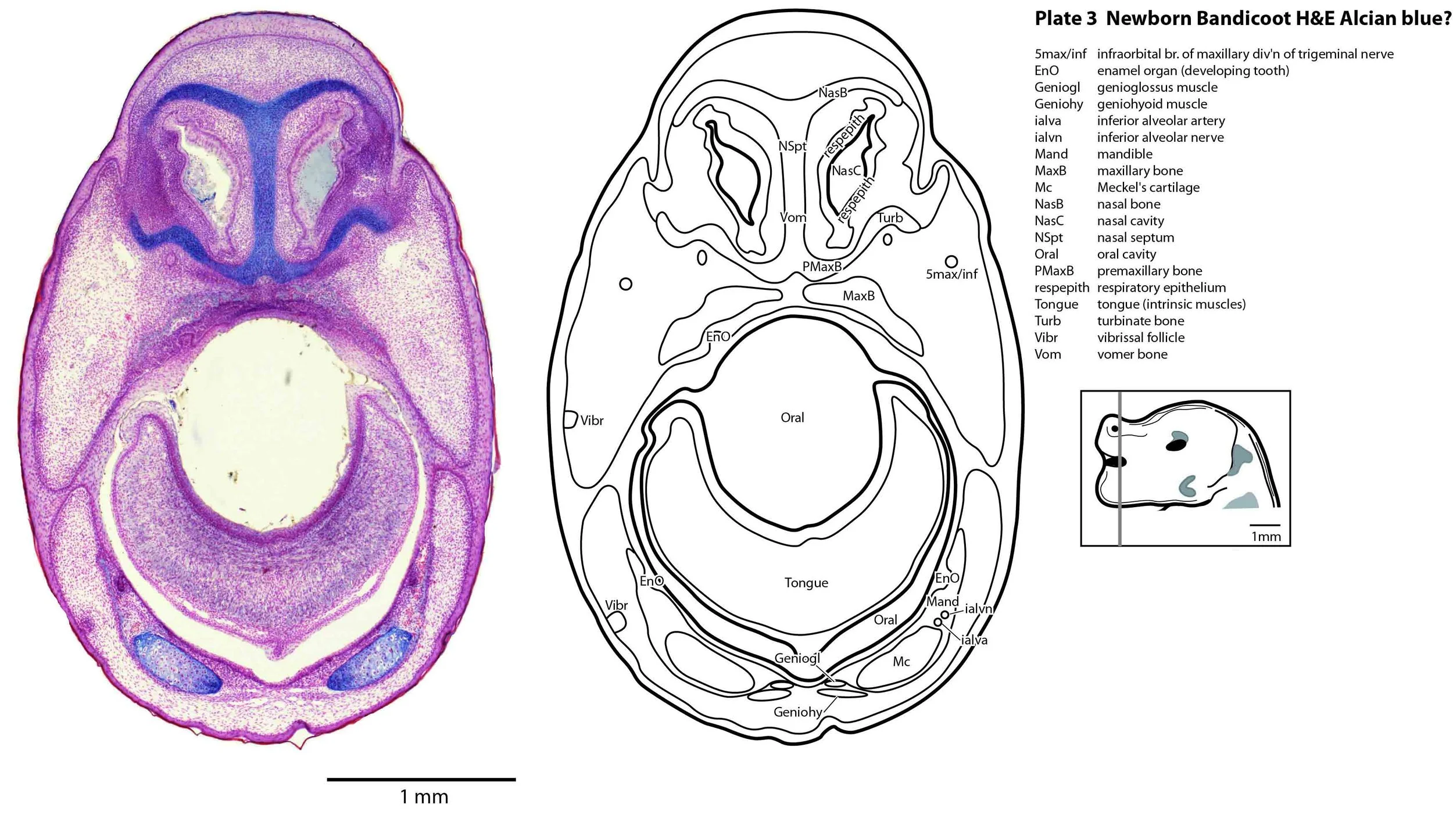 The specimen illustrated here is MS221 (Perameles obesula, newborn, GL of 15.5 mm, HL of 6.5 mm, 16 slides of sections) of the Hill collection stored at the Museum für Naturkunde in Berlin. The specimen had been collected in the late 19th century, embedded in paraffin wax and sectioned at 12 µm thickness, before being stained with hematoxylin and eosin as the predominant stain, with some sections apparently stained for alcian blue (hence the blue cartilage) or hematoxylin alone.