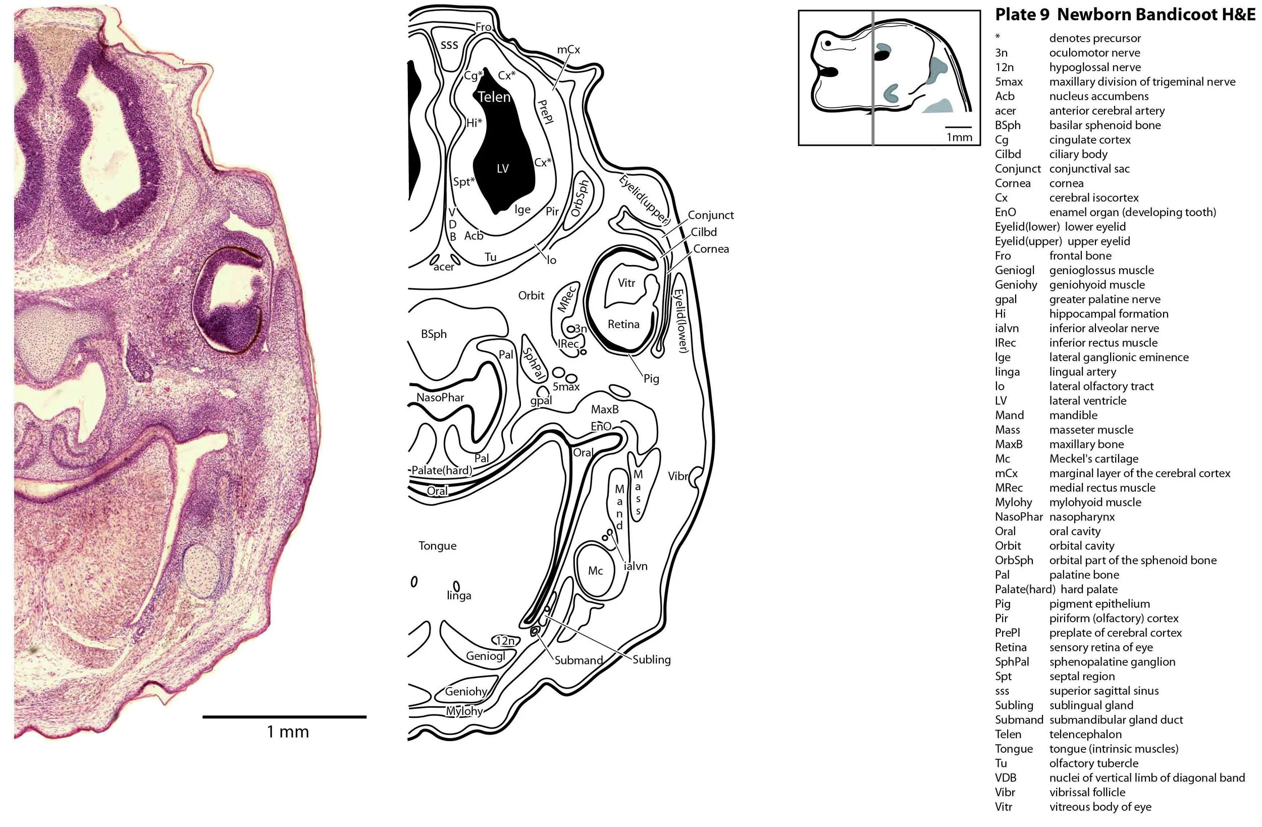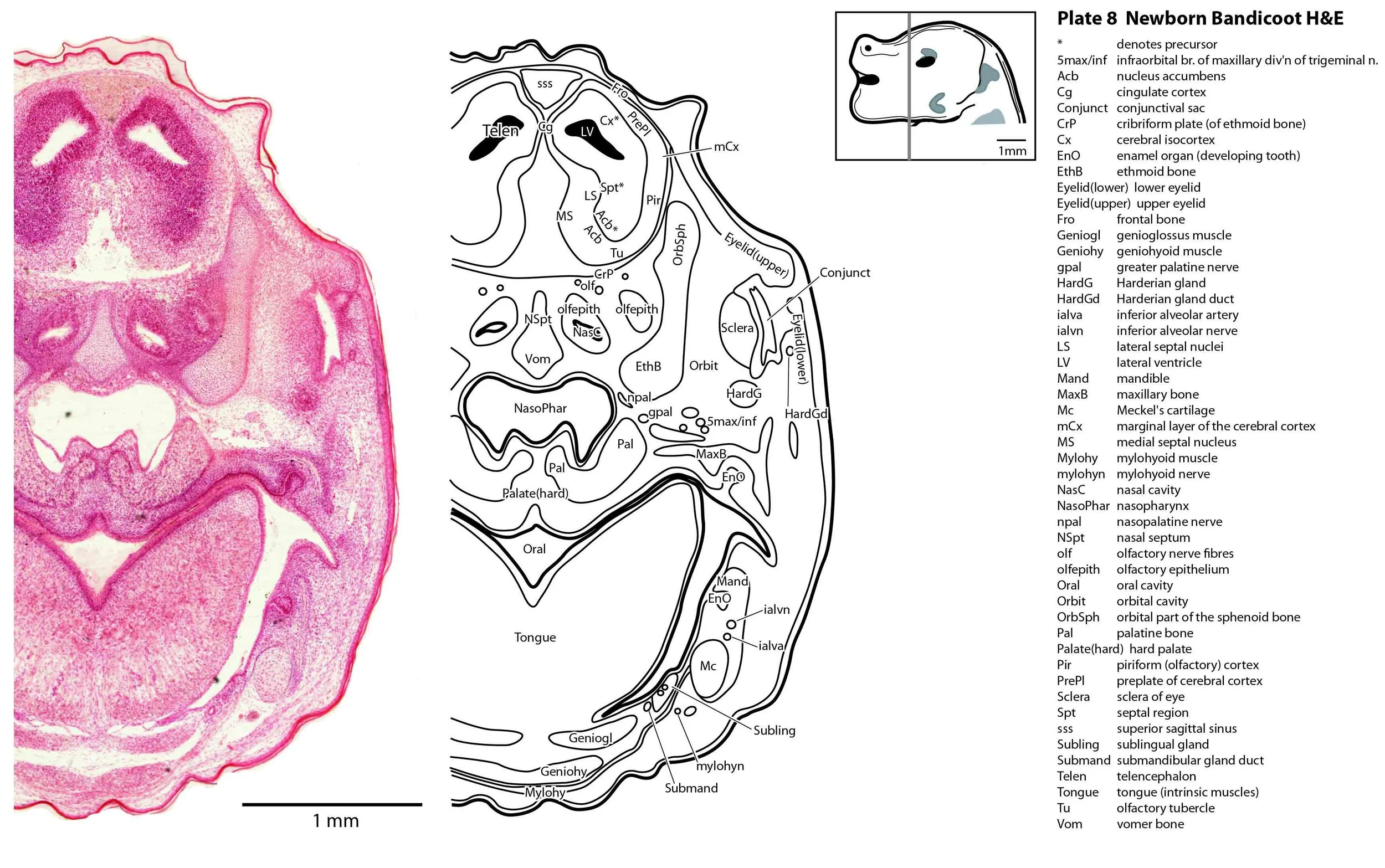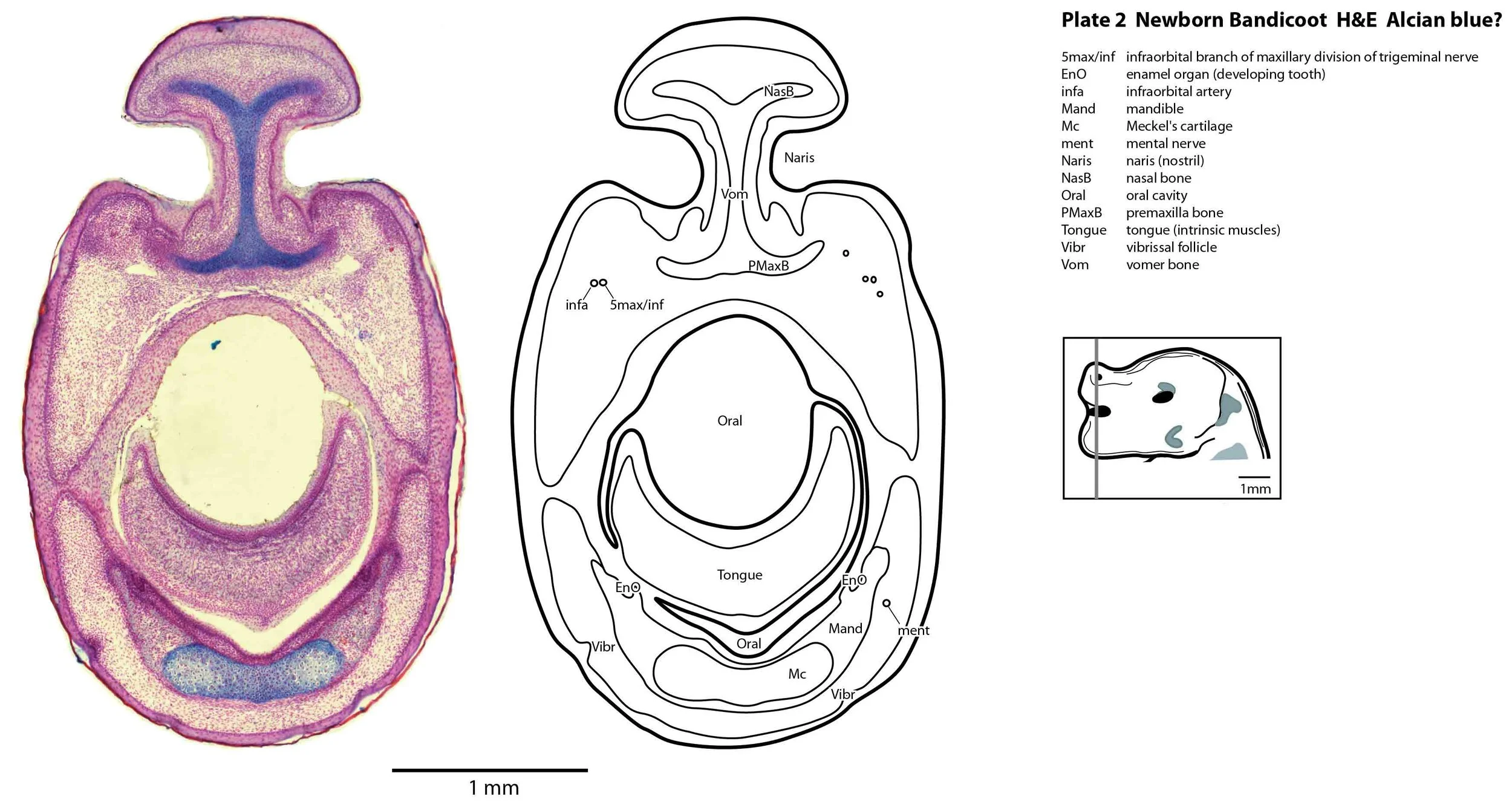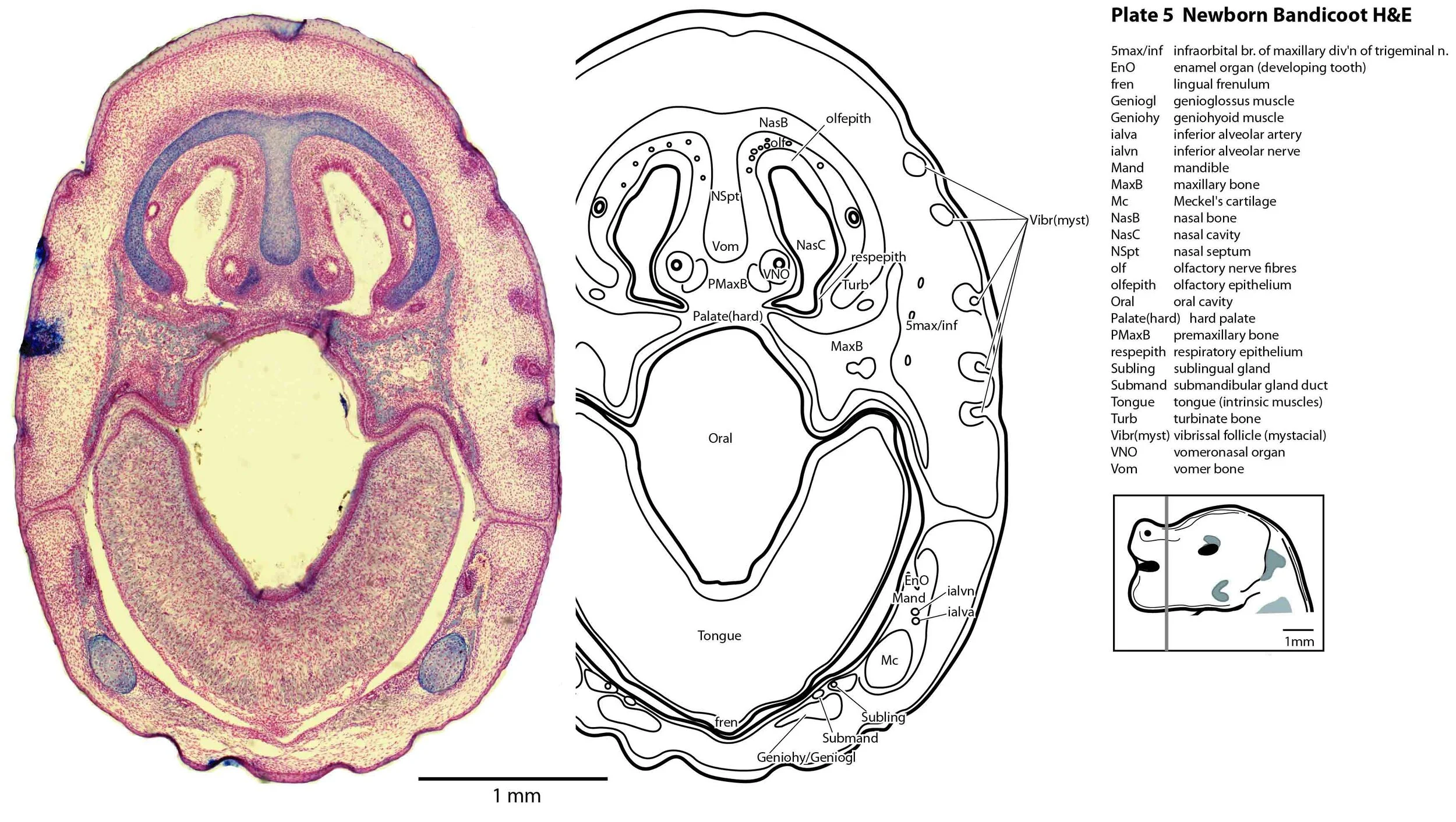 The specimen illustrated here is MS221 (Perameles obesula, newborn, GL of 15.5 mm, HL of 6.5 mm, 16 slides of sections) of the Hill collection stored at the Museum für Naturkunde in Berlin. The specimen had been collected in the late 19th century, embedded in paraffin wax and sectioned at 12 µm thickness, before being stained with hematoxylin and eosin as the predominant stain, with some sections apparently stained for alcian blue (hence the blue cartilage) or hematoxylin alone.