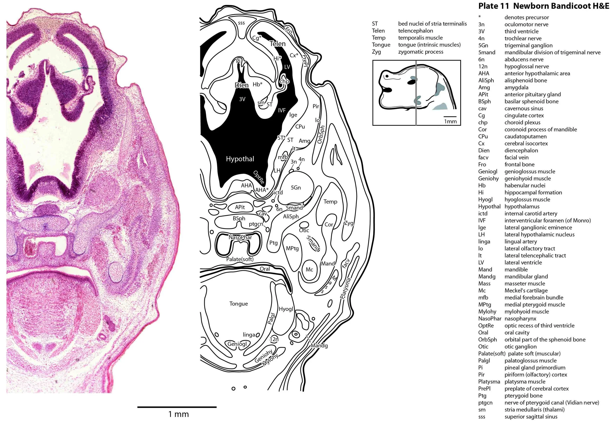 The central nervous system is immature in this specimen compared to a newborn placental mammal such as the laboratory rat. The telencephalon has paired telencephalic vesicles (e.g. plates 10, 11) but the proliferative compartment known as the ventricular germinal zone (Cx*) is thicker than the preplate (PrePl) that contains the post-mitotic neurons. This is particularly the case in more caudal parts of the telencephalic vesicle (e.g. plates 13, 14) where the preplate is negligible. This suggests a distinct neurogenetic gradient in the developing bandicoot isocortex, such that rostral or anterior parts (frontal, motor, rostral somatosensory cortex) are in advance of caudal or posterior parts (caudal somatosensory, visual cortex).