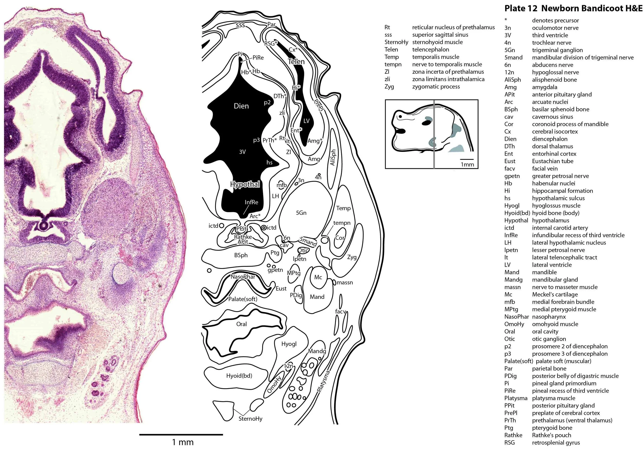 The diencephalon (plates 12 to 14) can be divided into prethalamus (previously ventral thalamus), (dorsal) thalamus, and pretectum, derived from prosomeres 3, 2 and 1, respectively. Some white matter has begun to appear on the exterior of the forebrain. These include the stria medullaris thalami (sm; plate 11), lateral telencephalic tract (lt; plates 11 to 13) and cerebral peduncle (cp; plates 13 to 16). Both the lt and cp are substantially smaller than in a newborn tammar, but all white matter tracts in the newborn bandicoot are much larger than in a newborn quoll, highlighting the intermediate level of CNS maturation in this species.