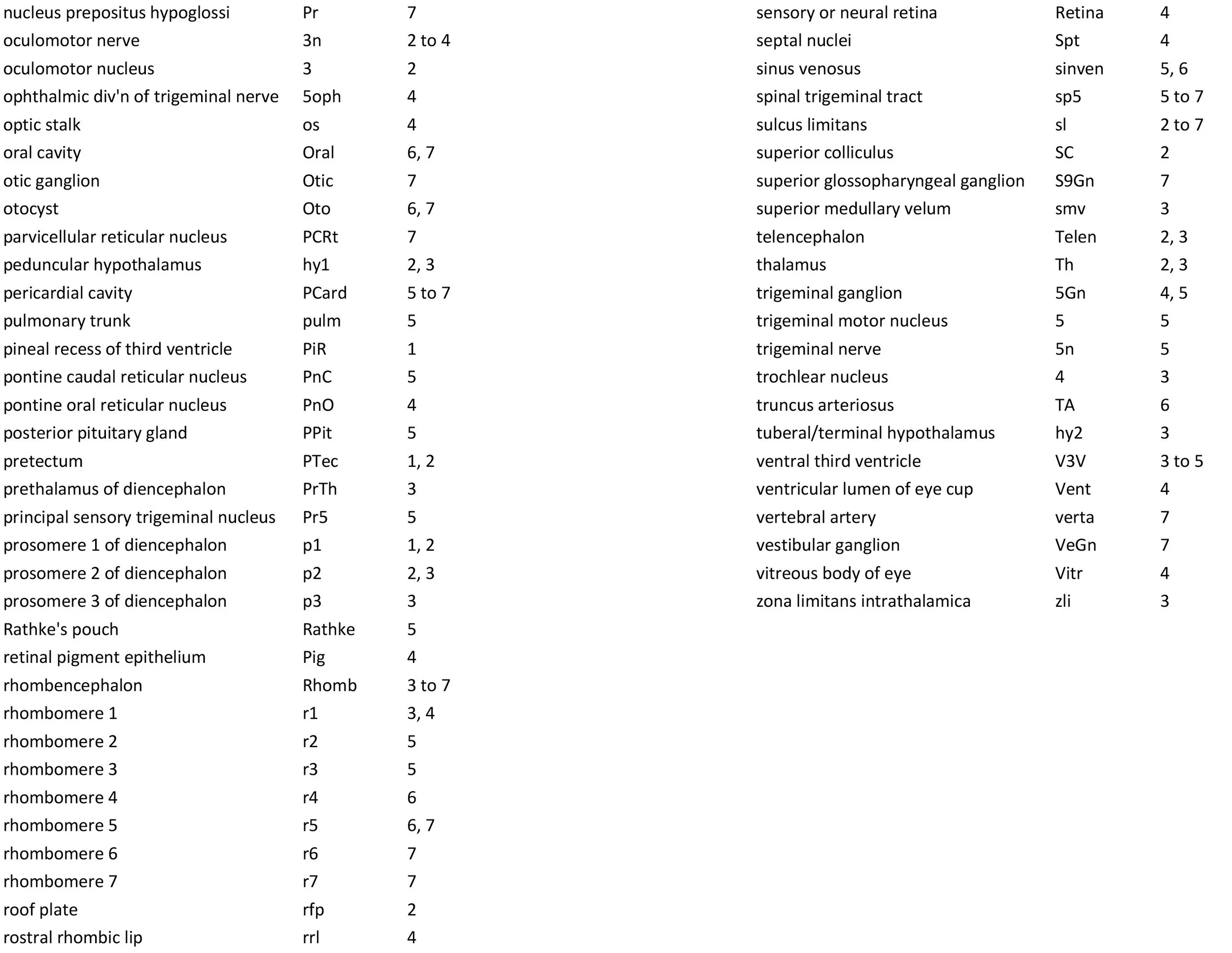The brainstem is the most differentiated part of the brain. There is a thin trigeminal sensory nuclear complex (Pr5, Sp5O, Sp5I; variously in plates 5 to 7) in the lateral tegmentum of the brainstem. There is also a thin medial magnocellular reticular formation (Gi; plates 6 to 7).