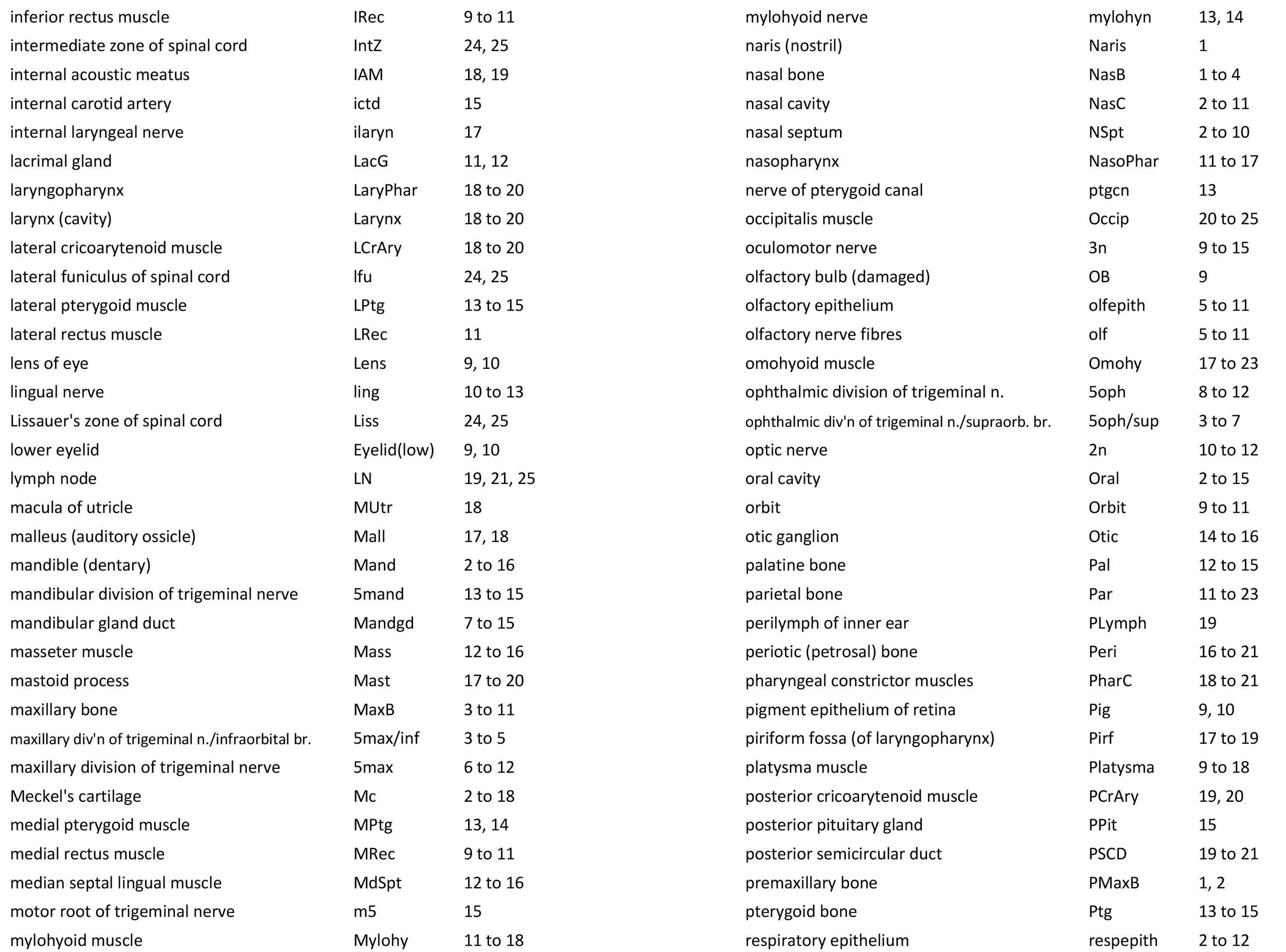 The brain is very poorly preserved, probably due to poor fixation of tissue within the cranium prior to embedding. It also appears that extraneous tissue (muscle, gut) has been stuffed into the cranial cavity prior to histological processing. Nevertheless, some intracranial structures (e.g. trigeminal ganglion, 5Gn – plates 13 to 16; pituitary gland, APit and PPit – plates 14, 15) and the spinal cord (SpC – plates 23 to 25) are present and much of the cranial peripheral nervous system is still visible.