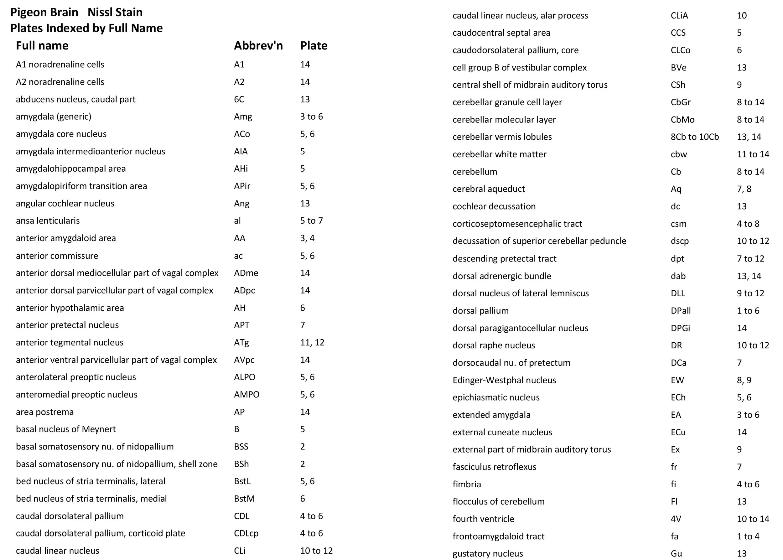 Puelles L, Martinez-de-la-Torre M, Paxinos G, Watson C, Martinez S (2007) The Chick Brain in Stereotaxic Coordinates. An Atlas featuring Neuromeric Subdivisions and Mammalian Homologies. Academic Press.