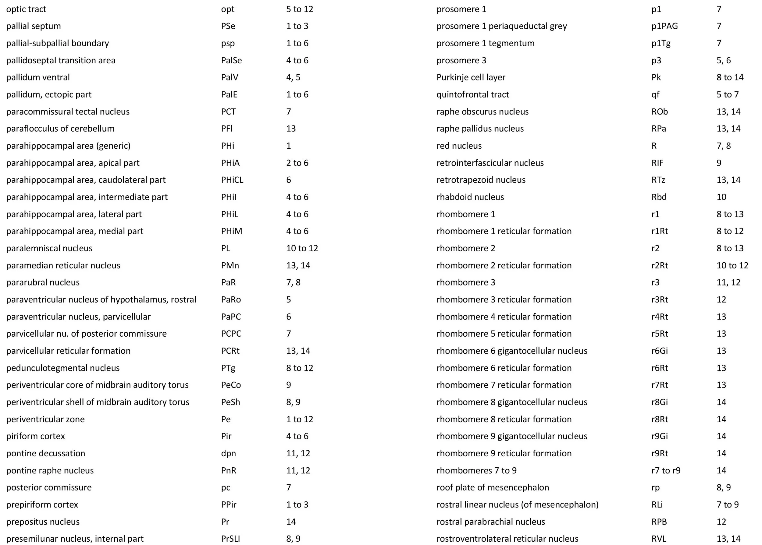 Nomenclature and delineation were based on a detailed atlas of the chick brain (Puelles et al., 2007), because the brains of the chicken and pigeon are very similar. Readers are referred to that work for detailed explanations of neuromeric subdivision in the mature avian brain.