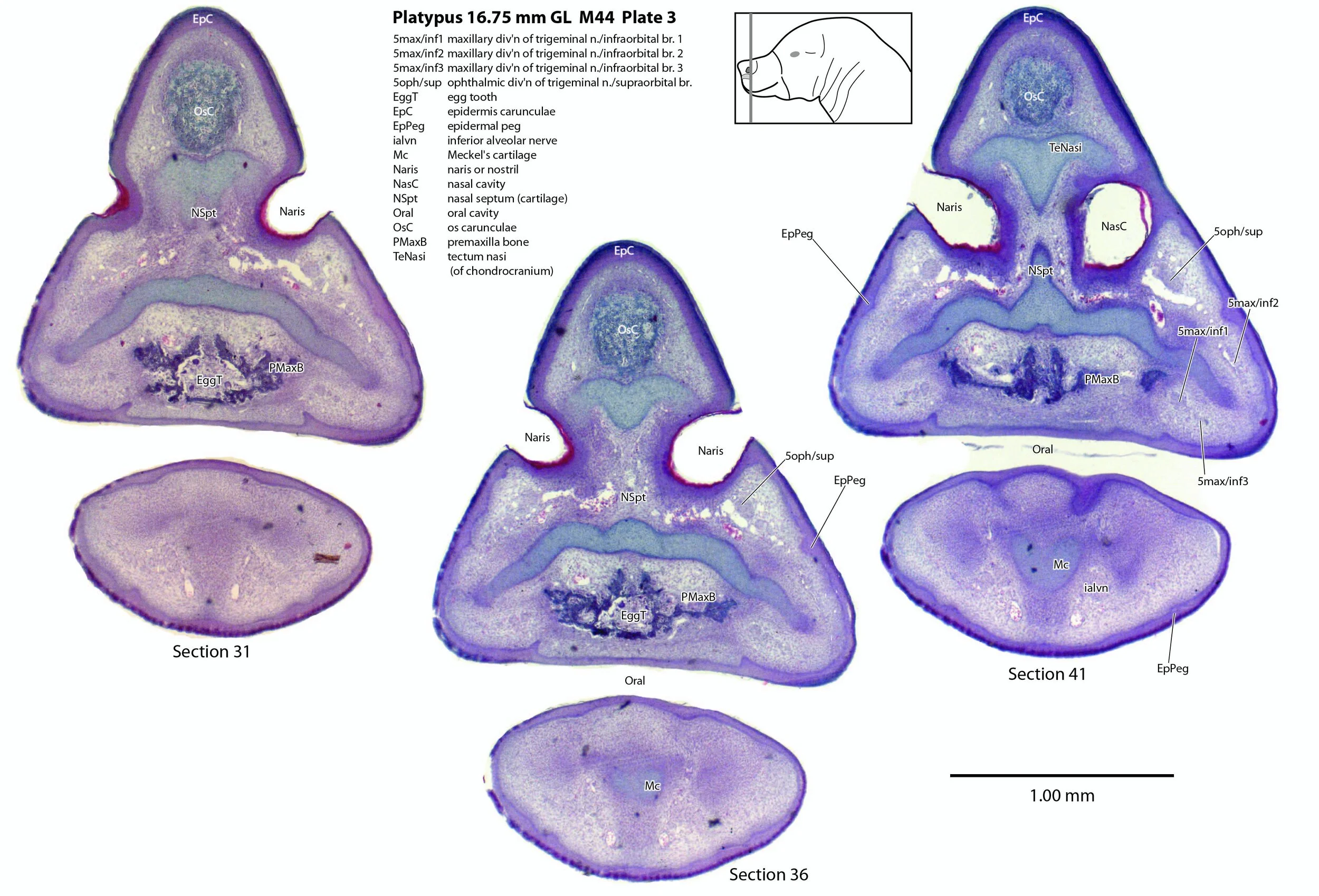The specimen illustrated here is M44 (a newly hatched platypus) of the Hill collection, stored at the Museum für Naturkunde in Berlin. The most likely site of collection is eastern New South Wales, near Sydney. Note that the specimen card states 16.45 mm GL (newly hatched), but the slides state 16.75 mm GL.