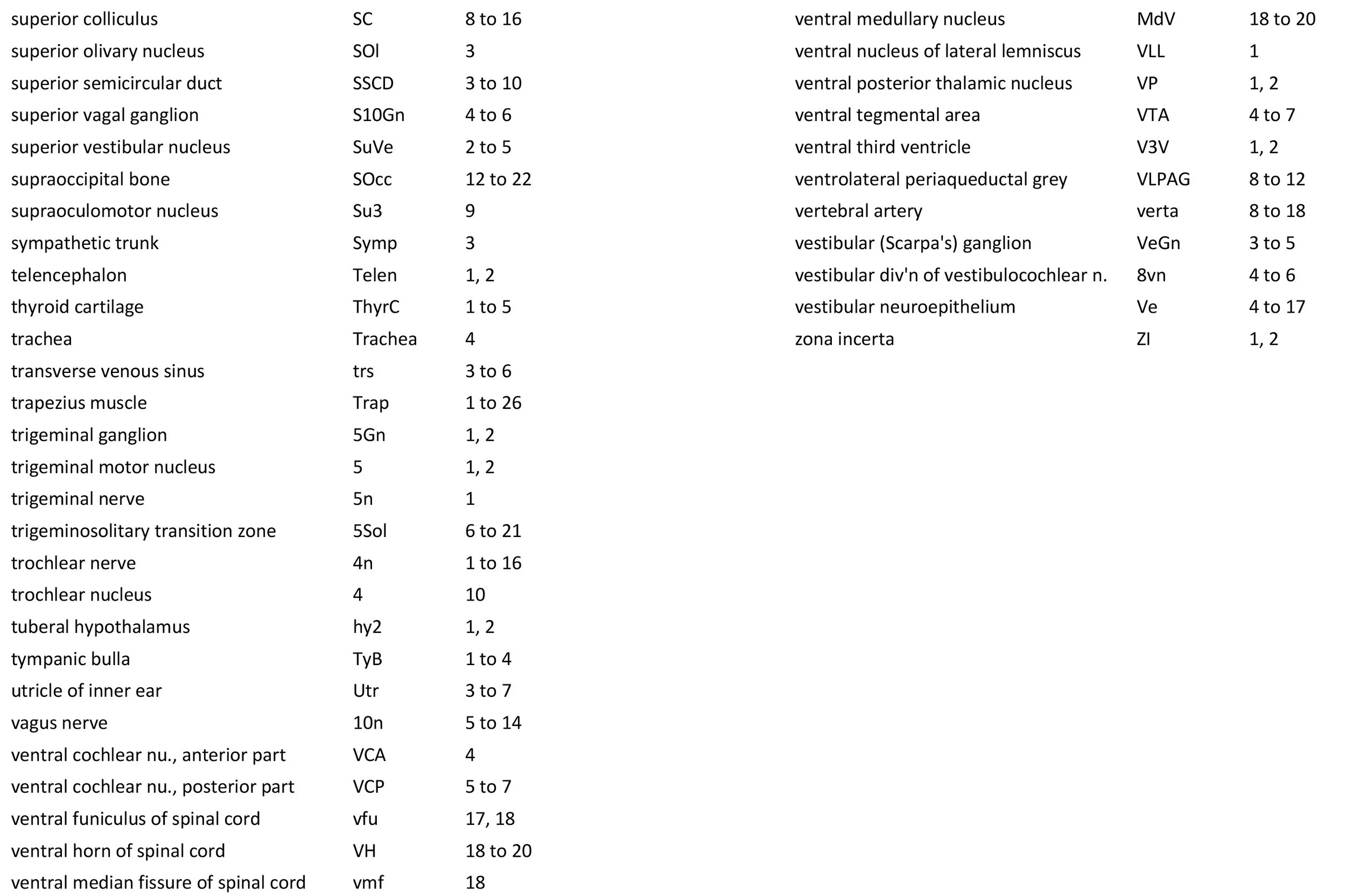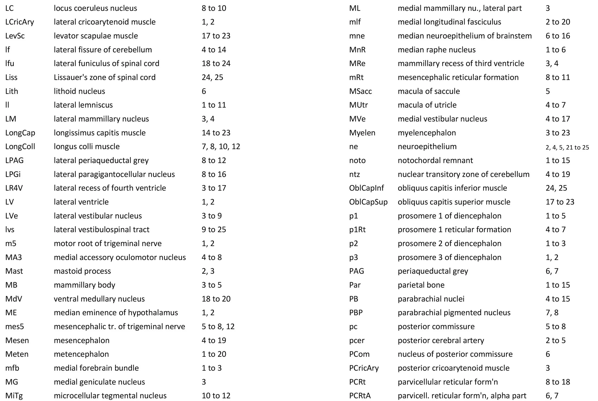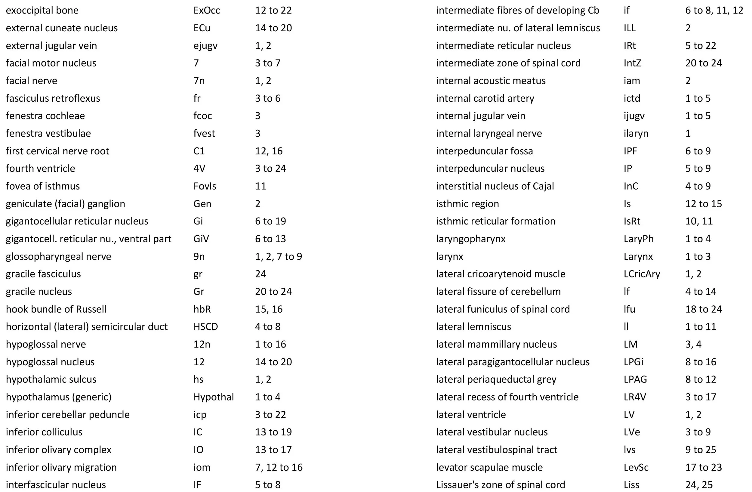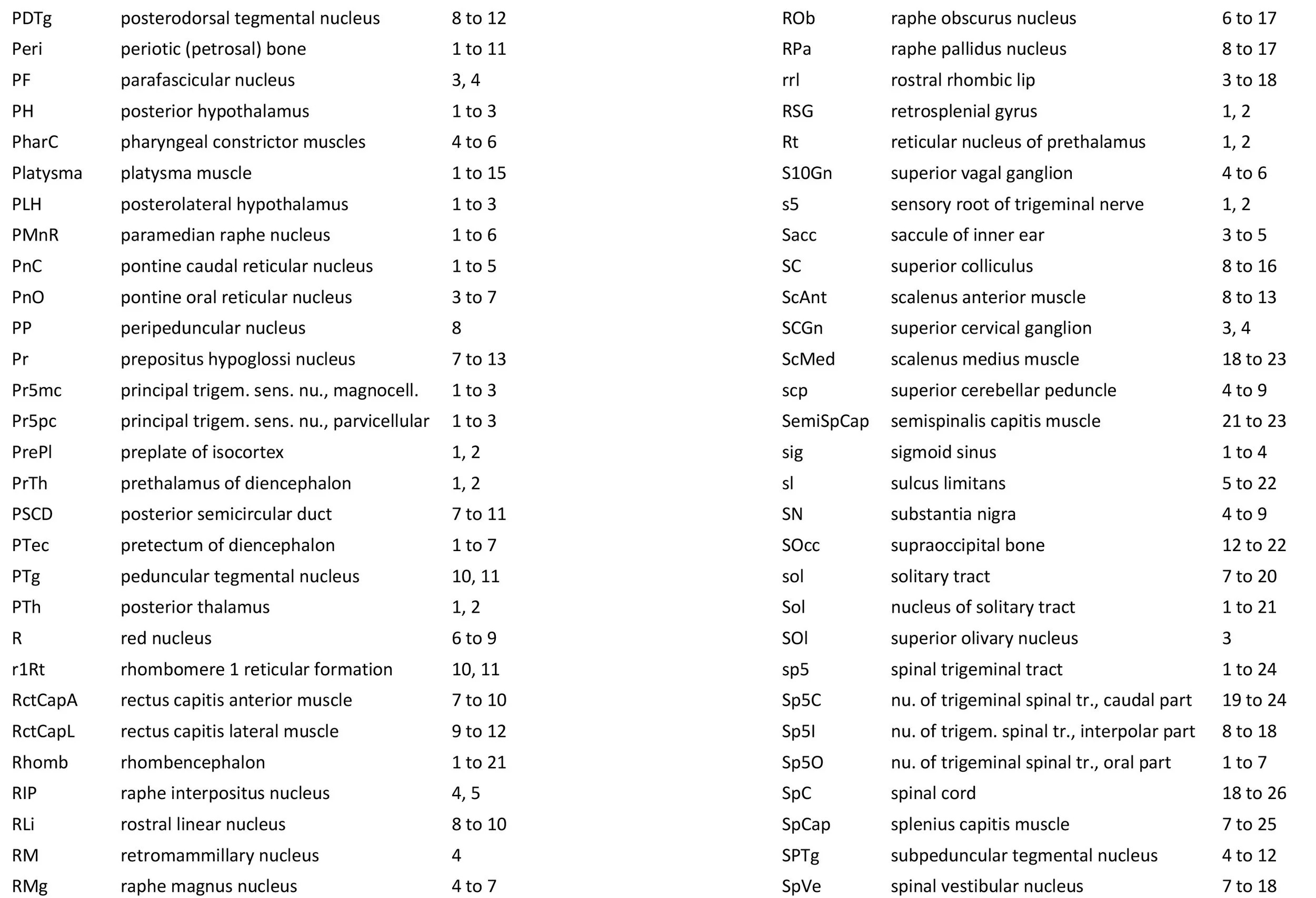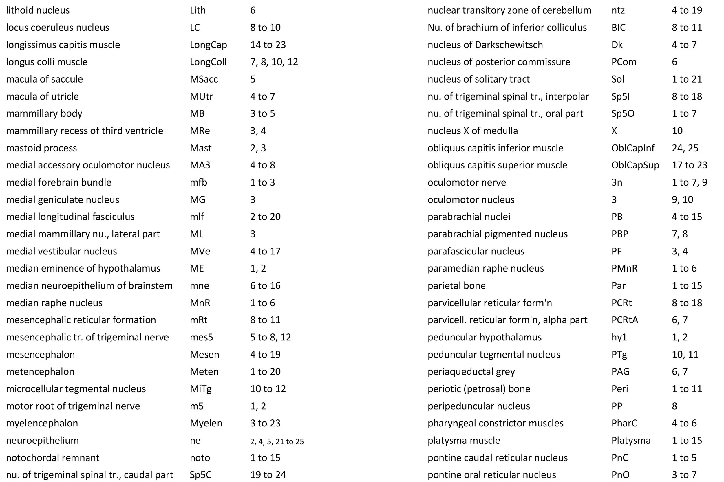 As for all vertebrates, the rhombencephalon is organised into functionally distinct radial wedges fanning out from the basal (motor neuroepithelium) and alar (sensory neuroepithelium) plates. The most medial neuronal group is the raphe nuclei (MnR, PMnR, RMg, ROb, RPa), flanked in succession by a large neuronal (gigantocellular) region (DPGi, Gi, GiV, LPGi in plates 6 to 19), an intermediate (autonomic) zone (IRt in plates 5 to 22), a parvicellular zone (PCRtA and PCRt in plates 6 to 18), and finally a group of sensory columns (trigeminal and solitary nuclei medially, vestibular and cochlear nuclei laterally).